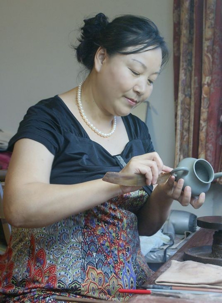 今年四十七歲的洪美華,造紫砂壺已有三十年。她於一九八○年進紫砂工藝廠學習,師從高級工藝美術師張紅華,熟習各種砂壺製作技法。一九九三年進修於中央工藝美院,二○○七年跟從清華大學美術學院朱耀奎教授學習,二○○九年畢業於美國美聯大學藝術設計專業。作品以光素器為代表,更擅長於全手工製壺。