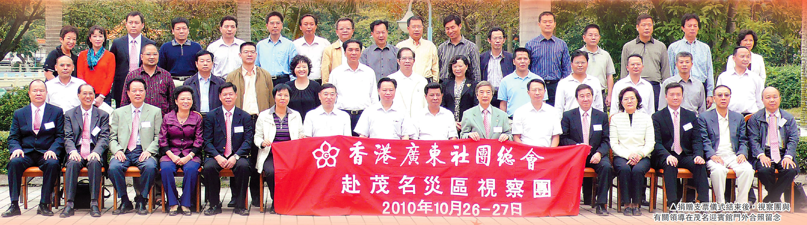 香港廣東社團總會積極響應廣東省委統戰部的呼籲,迅速廣泛動員該會首長、常董、會董,會員、團體會員,籌到一千萬元人民幣,為受災地區重建千間平房,彰顯天災無情、人間有愛的精神。9月26至27日,該會主席王國強、副主席兼秘書長楊志紅,副主席劉劍明(香港茂名同鄉總會主席)、王賜豪,中聯辦協調部部長高級助理李新樂等一行二十多人深入災區視察,探訪災民,並將善款支票遞交茂名市政府領導,盡顯血濃於水的人間大愛。\圖、文 黃穎雅