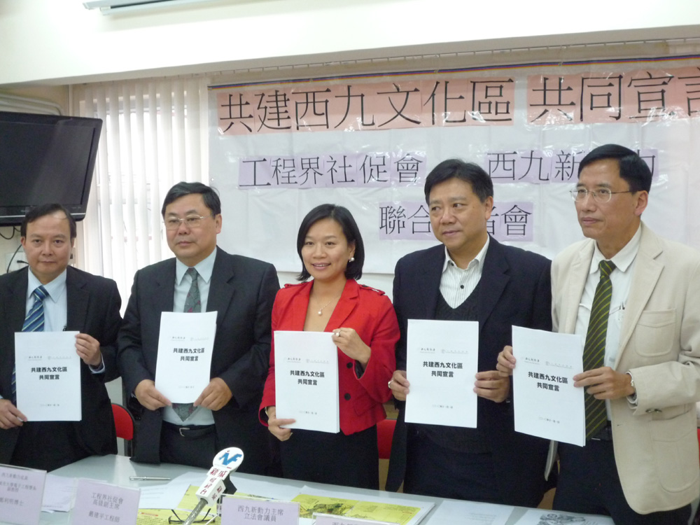 圖:西九新動力和工程界社促會促請當局將西九文化區詳盡設計交由本地建築師負責,中為梁美芬