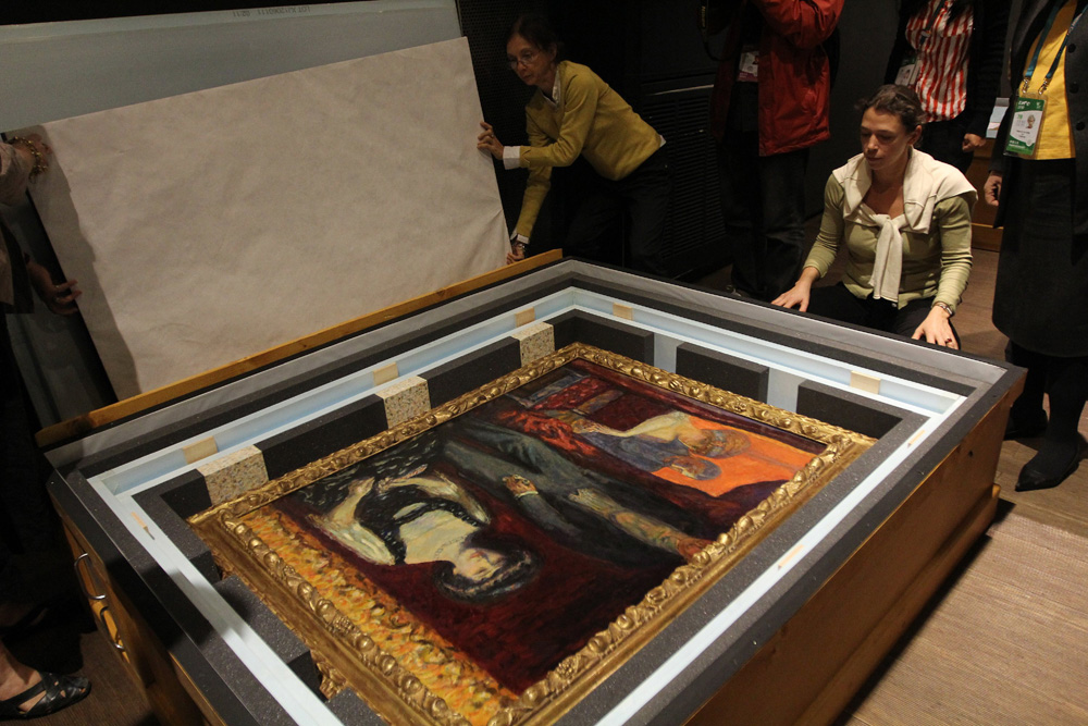 圖:上海世博會法國館展出梵高的《阿爾的舞廳》、米勒的《晚鐘》和羅丹的雕塑《青銅時代》等法國國寶級的藝術品,在經過上海海關工作人員現場查驗後,即將啟程回國。圖為海關關員查驗博納爾的名畫《化妝間》\新華社