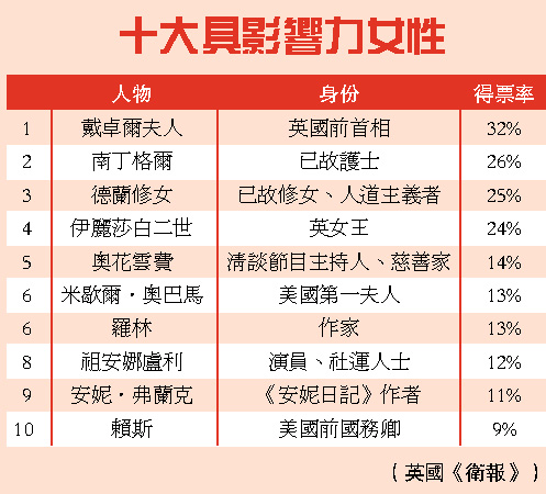 一項調查顯示,英國前首相戴卓爾夫人被視為最有影響力的女性,在女性典範排行榜中居首,力壓排第二的「護士之母」南丁格爾和第三的德蘭修女。