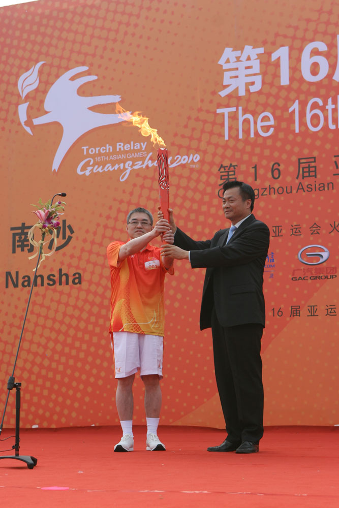 圖:南沙區區長羅兆慈(右)將亞運聖火交給第一棒火炬手香港霍英東集團的霍震宇       本報攝
