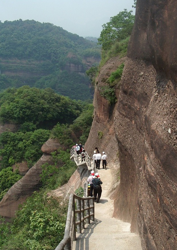 中層景觀主要有別傳寺和丹梯鐵索。別傳寺是丹霞山唯一佛寺大廟,其規模之大,可與南華寺和飛來寺媲美;丹梯鐵索則是丹霞山最奇險之處,眼前那八十多度陡峻的階梯,沿岩壁鑿成,非常陡窄,攀登者的腳也不能正踏,只能扶着鐵索側身而上,身懸半空,讓下面的遊客看得心驚膽戰。不過,攀上丹梯鐵索遠比下來容易,看着眼前的懸崖,一些膽小的女子最後只敢面對着石壁,小心翼翼的往下挪。