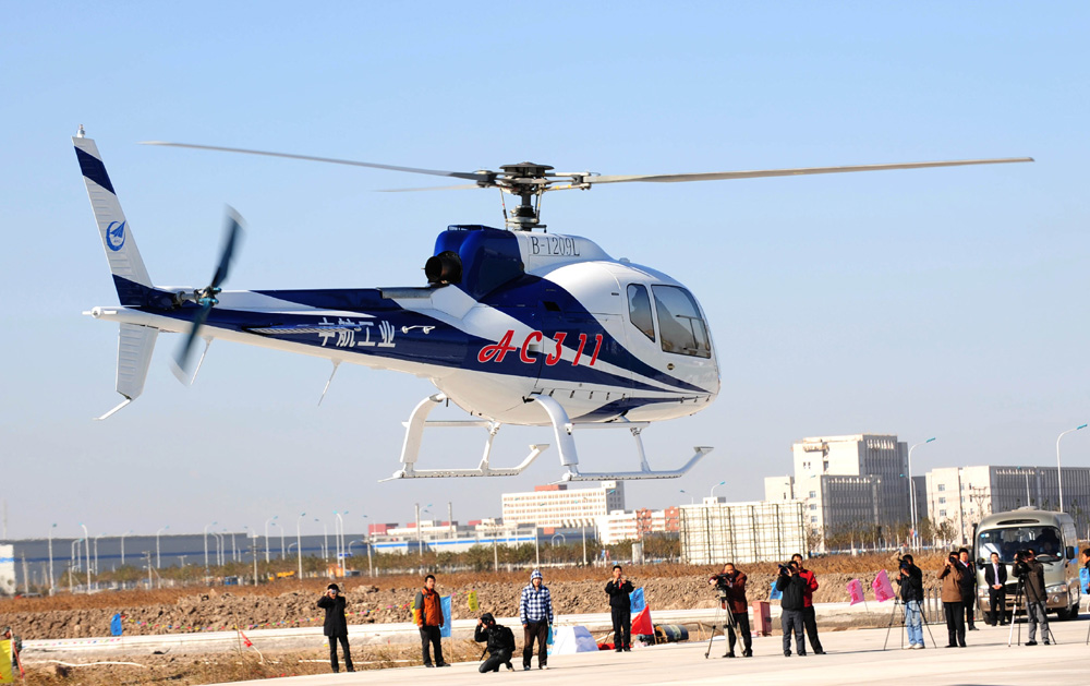 圖:由中國航空工業集團公司自主研製的國產輕型多用途直升機AC311在中航直升機天津分公司完成總裝下線,昨日成功首飛,由中國飛龍通用航空公司接收並投入運營\新華社