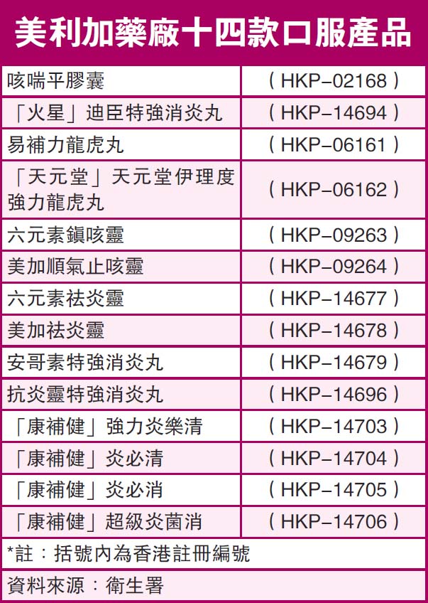 【本報訊】本地持牌中成藥製造商美利加懷疑生產線受污染,繼口服產品「咳喘平膠囊」發現微生物含量超標,「『火星』迪臣特強消炎丸」亦出事。衛生署昨日指令美利加藥廠從市面回收,所有由其生產的十四款口服產品,以及即時停止生產。