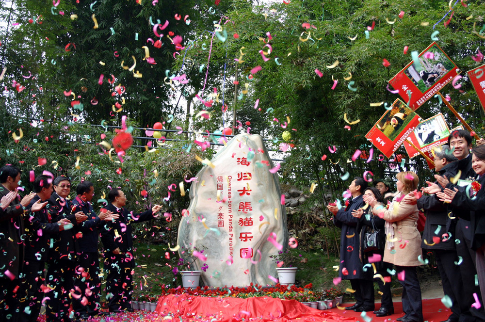 圖:臥龍「海歸大熊貓樂園」19日在四川雅安落成。圖為國家及四川林業部門有關負責人為「樂園」落成揭牌\新華社