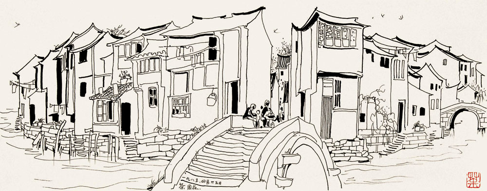 圖:《水鄉周莊》,鋼筆·碳素墨水,一九八五年,上海美術館藏