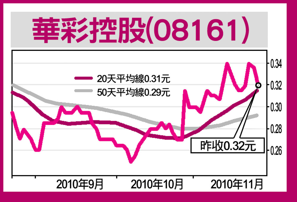 早前,有關部門已落實開放互聯網及電話彩票銷售,市場估計包括福彩中心及體彩中心兩個彩票發行機構,明年第一季度之前將挑選出相關的銷售全國代理,華彩挾在行內的多年經驗,料可成指定銷售代理之一,股價自然看漲,0.3元水平應該買得過。