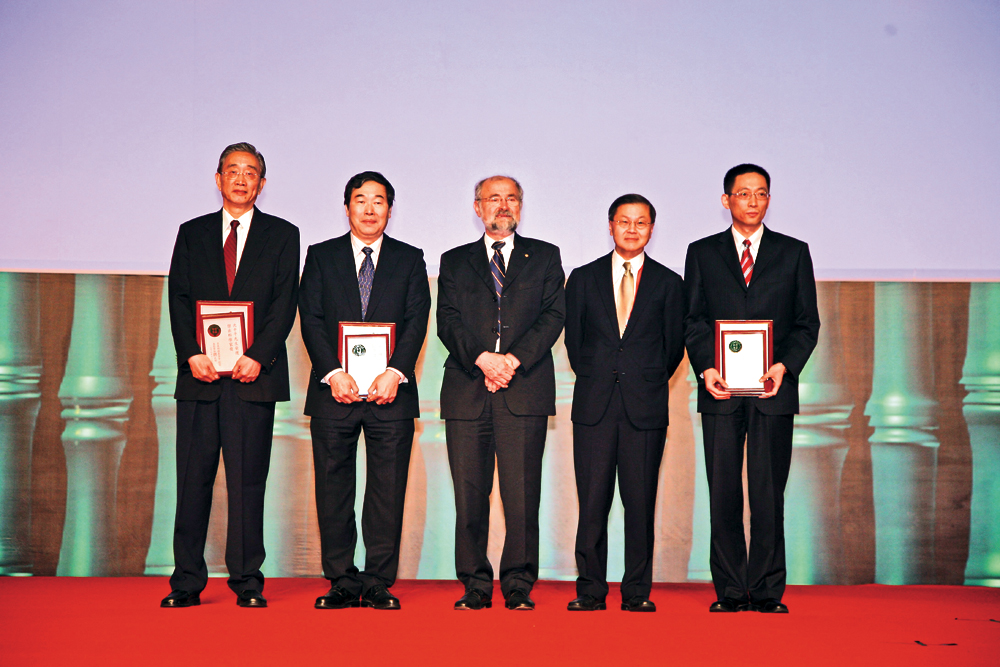 圖:「求是」傑出科學家獎得主(右一)施一公、(左一)沈平平、蒲慕明(左二)與顧問何大一(右二)及頒獎嘉賓合照
