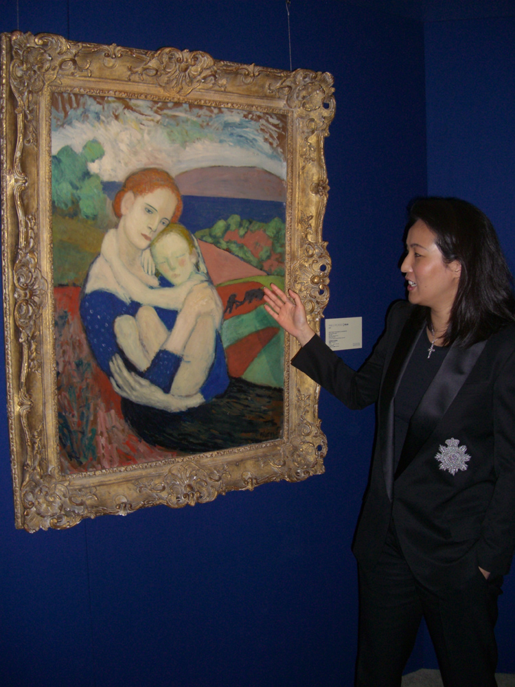 蘇富比亞洲區主席黃林詩韻表示,每幅油畫價錢及來源皆保密,僅能透露畢加索《母親抱着小孩(母愛)》訂價接近二億港元,為全場之冠。此畫是畢加索早期重要作品,是他第二次旅居巴黎時(一九零一年)所作,標誌着藝術家「藍色時期」新風格的萌芽,告別「夜總會歌舞表演風格」作出的重大轉變。此外,「母與子」主題在畢加索一生繪畫生涯中經常出現,可見此畫具深遠影響,畫作也表現出他傾向文藝復興典型宗教題材,受古典大師如拉斐爾等薰陶的痕跡。