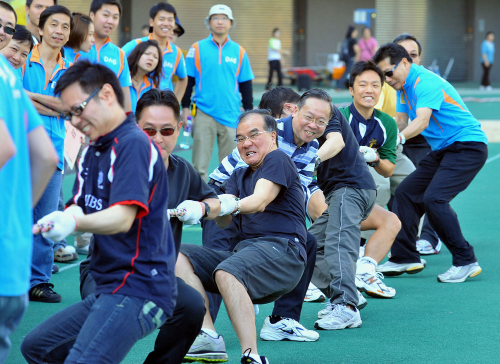 圖:一眾副局長和政助在拔河比賽中出盡氣力,最終以二比一反勝民建聯\本報攝