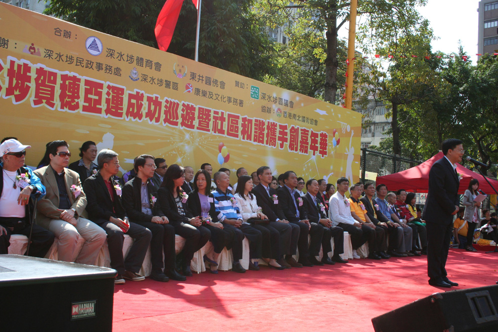 方向東在致詞中表示,本屆亞運會的成功舉辦有賴於祖國經濟發展、國力強大,政府的積極參與和廣大市民的全力支持。他希望香港市民亦能支持申辦亞運會,以使本港的體育水平邁上新台階。深水埗體育會主席盧永文和東井圓佛會會長林東,分別致歡迎詞和謝詞,感謝主禮嘉賓和街坊的支持。當天除了巡遊之外,亦有安排體育千人操和嘉年華。而為方便坊眾細看各巡遊隊伍的特色,大會在元州街、桂林街和欽州街的中段設了表演區,吸引街坊在巡遊路線兩旁和表演區觀賞,一同為香港運動員的佳績喝采歡呼。