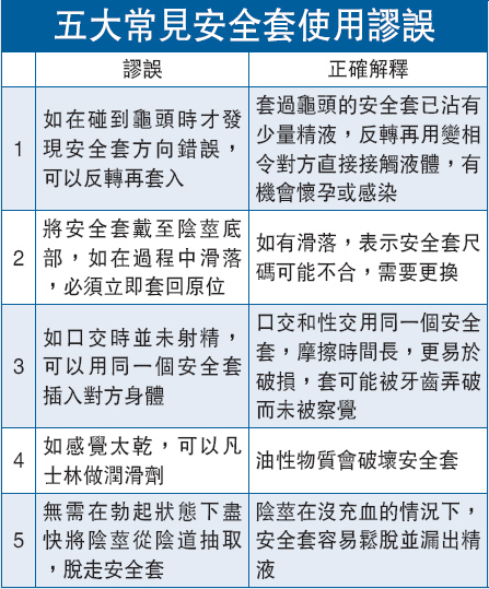 不少青年對使用安全套存在誤解,有兩成受訪者誤以為碰過龜頭的安全套,可以反轉方向後重新套入,殊不知可能已經接觸到精液,有機會造成懷孕或感染;近半數受訪者錯誤以為凡士林可以充當潤滑劑,而不知油性物質會破壞安全套。