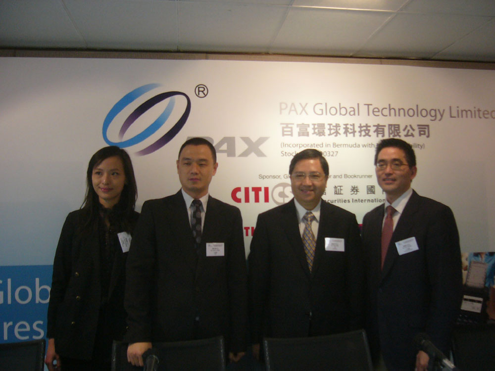 圖:電子支付終端機解決方案供應商百富環球今起招股,左起為百富環球財務總監郭妮霞、行政總裁蔣洪春、主席聶國明、公司秘書陳耀光