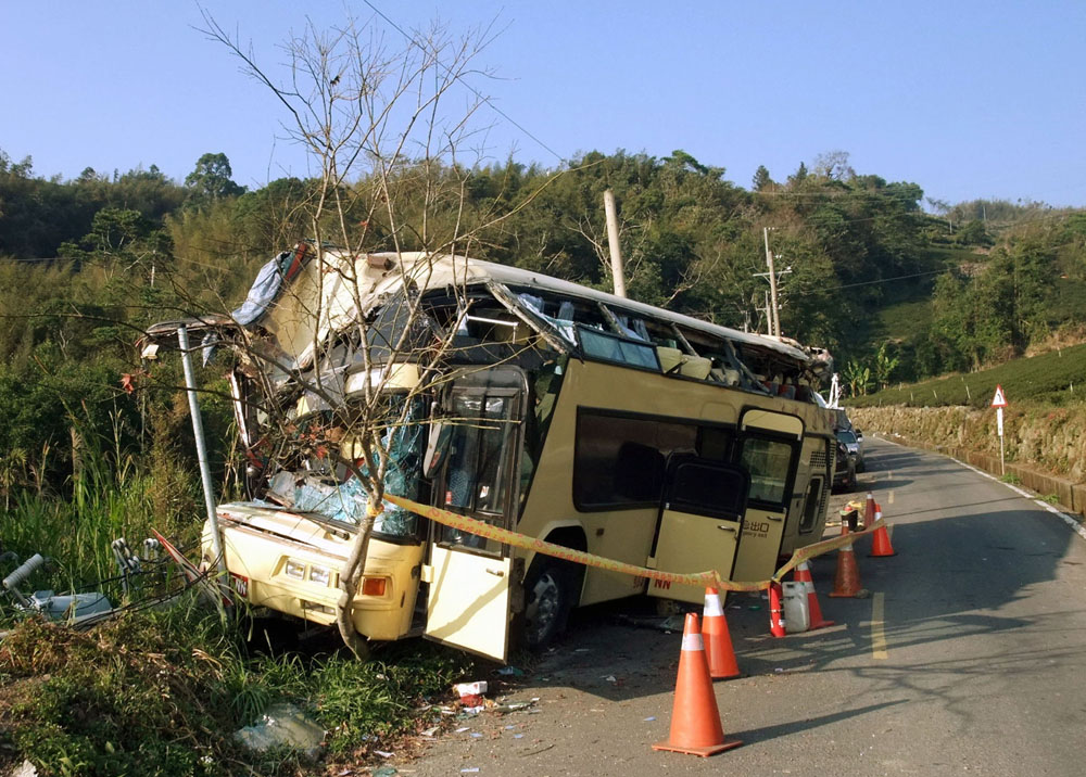 圖:阿里山鄉達邦公路12日發生3死、8重傷,及多人輕傷的車禍意外,肇事的遊覽車扭曲變形,可見當時撞擊力道強大\中央社