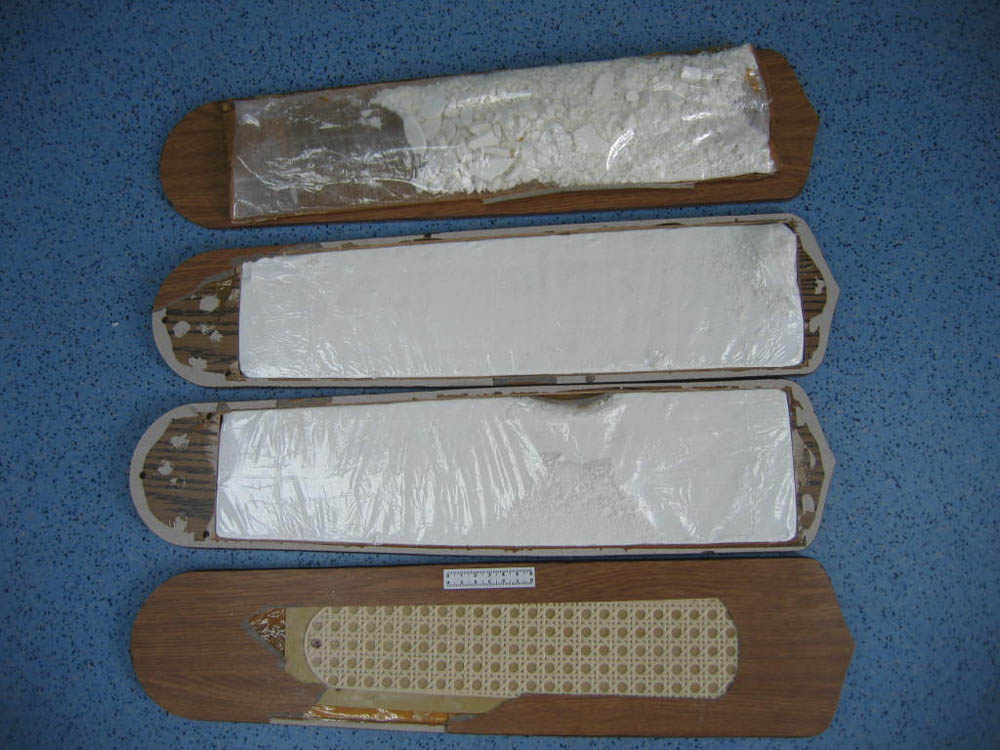 10月20日,深圳海關對國際郵包進行例行檢查,發現其中一個來自巴西的郵包有異常,經開拆查驗發現內裝有一組工藝吊扇,關員輕敲扇片時發出的聲音不太正常,懷疑裡面被掏空,於是將扇片拆開,發現內藏有塑料袋包裝的白色粉末,經鑑定為可卡因,共1008克。