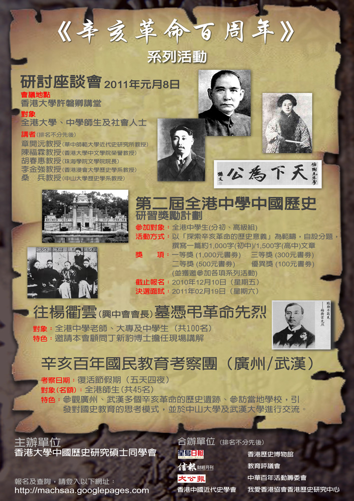 主辦單位特意把第一項活動安排在二○一一年一月八日,作為辛亥革命百周年紀念年的第一炮。何漢權表示,將在港大許磐興講堂舉行一場學術研討會。講者包括編著《辛亥革命史》的史學家章開沅、廣州中山大學孫中山研究所副所長桑兵、著有《孫中山與五四運動》等作品的香港學者陳福霖、香港孫中山紀念公園碑文撰稿人李金強;還有來自台灣的香港珠海學院文學院院長胡春惠。
