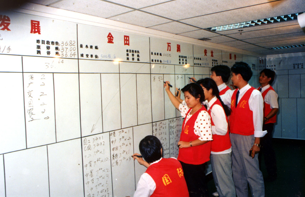 圖:1991年的深交所交易廳採用人工手寫的白板競價\新華社