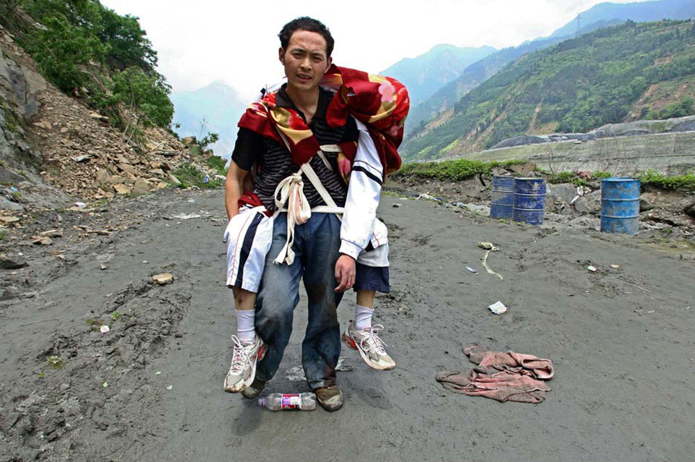 圖:四川大地震後,賀延光拍下父親揹負兒子屍體回家的一幕