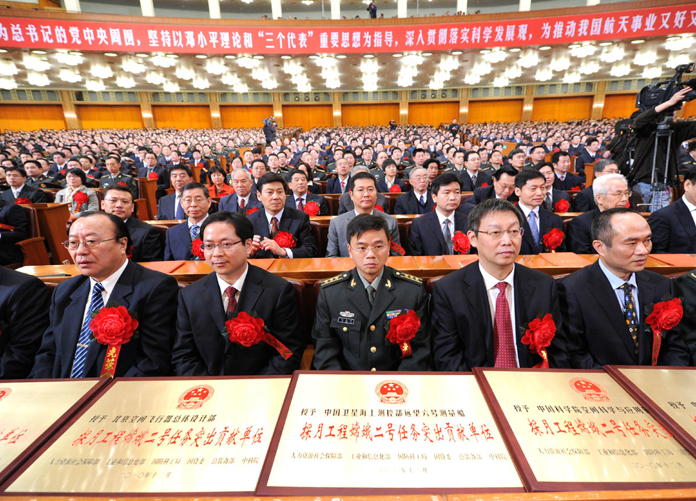 圖:中共中央、國務院、中央軍委20日在北京人民大會堂舉行大會,慶祝我國探月工程嫦娥二號任務圓滿成功。圖為出席慶祝大會的代表新華社