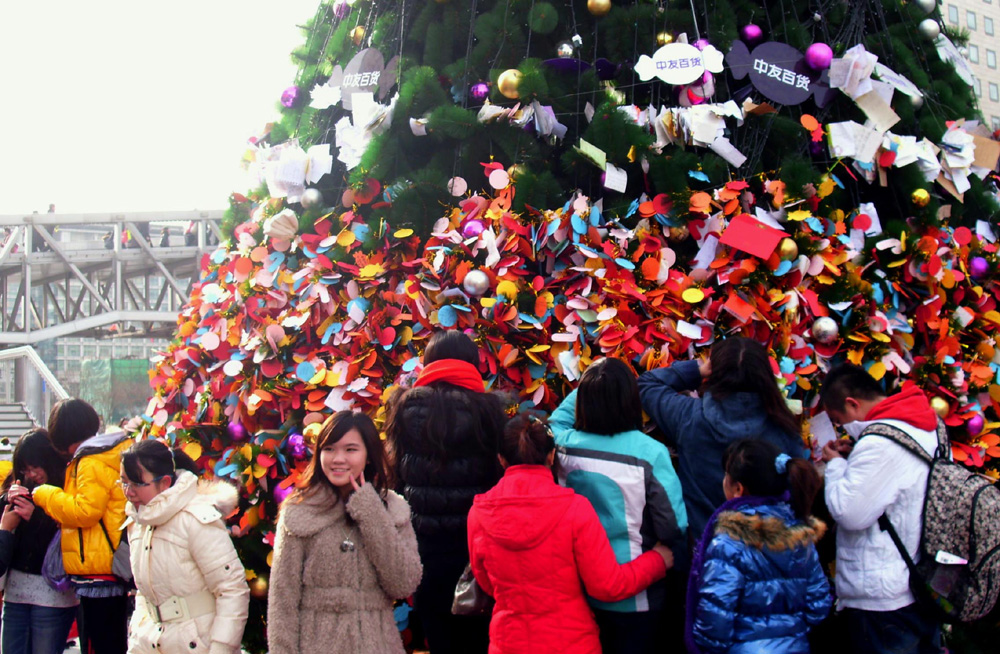 圖:12月25日正值聖誕節,在北京繁華的西單街頭,眾多男女青年在巨大的聖誕樹上掛上許願卡,祈盼幸福平安 中新社