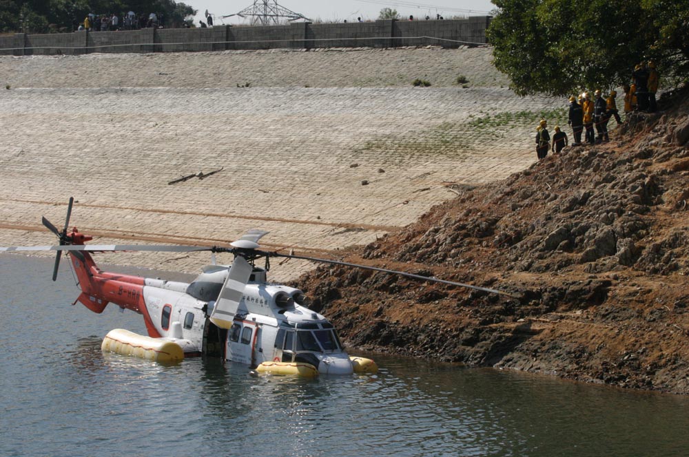 直升機落在東面主壩水面,其後向西漂移數百米至菠蘿壩附近,消防蛙人落水用繩固定機身,並逐漸拉返岸邊,機身表面完整,沒有重大損毀。民航處派員到現場了解事件,並準備將肇事直升機部分組件拆去,以方便運走,至傍晚工作仍在進行。
