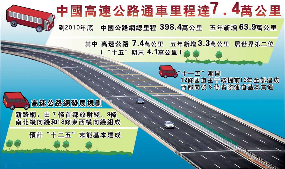 全國交通運輸工作會議披露,「十一五」末,中國公路網總里程達到398.4萬公里,5年新增63.9萬公里。其中高速公路由「十五」期末的4.1萬公里發展到7.4萬公里,新增3.3萬公里。「五縱七橫」12條國道主幹線提前13年全部建成,西部開發8條省際通道基本貫通。杭州灣跨海大橋、蘇通長江大橋、舟山連島工程、秦嶺終南山隧道、上海崇明隧橋工程和廈門翔安海底隧道等重大工程相繼建成。