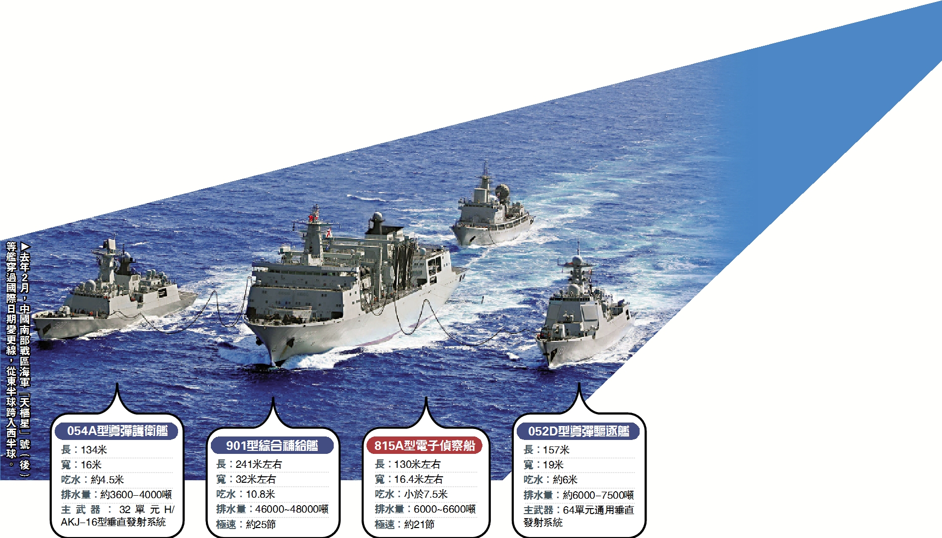 南海艦隊新春開訓的遠海編隊陣容成色十足,包括071型兩棲船塢登陸艦五指山艦、901型遠洋補給艦查干湖艦、052D型導彈驅逐艦銀川艦、054A型導彈護衛艦衡陽艦,以及815型電子偵察船天樞星船。