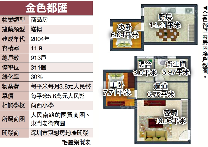 Q房國際羅湖口岸名園店置業經理趙先生介紹,小區一房一廳的租金可以放到4500元左右,2房1廳的大概可以租到5500到6000元,出租回報率不錯,很多港人買來出租。當然,自住也很不錯,出行方便,9號線可以去到深圳灣、1號線往東可以去到羅湖口岸、向西可以一路到深圳南山科技園及寶安區的機場東站。按照目前的成交價來計算,金色都匯一套36平米的房子售價是202萬左右,一套67平米的2房2廳售價是377萬左右。