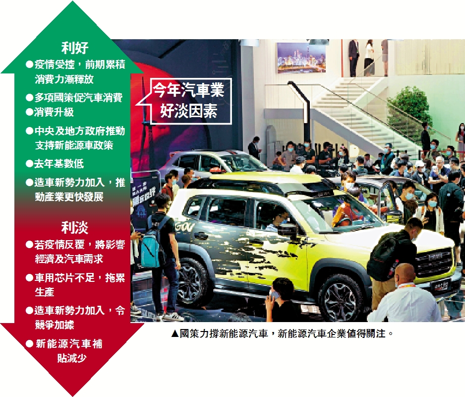 去年初,一場突如其來的疫情,令內地汽車業一度按下「暫停鍵」,但隨着疫情受控及國策推動,去年汽車產銷同比分別僅跌2%和1.9%。內地有效控制疫情,經濟迅速復甦,汽車銷售有望提升,而汽車業對拉動經濟發展甚為重要,特別是國策力撐新能源汽車,預計比亞迪(01211)等新能源汽車企業值得關注。再者,隨着汽車新勢力加入,汽車玻璃商、經銷商亦會水漲船高。