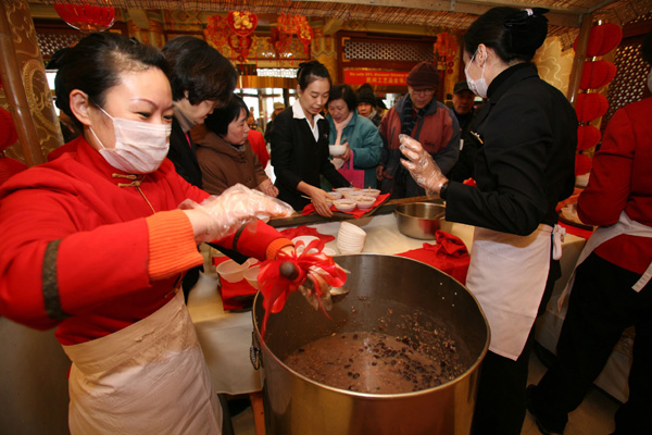 上午10時施粥開始,大廳裡已經排了五、六百人。身穿大紅色服裝的服務員手持大勺,不斷往眾人碗裡添粥。不一會,四、五桶濃厚香稠的臘八粥就發放一空。