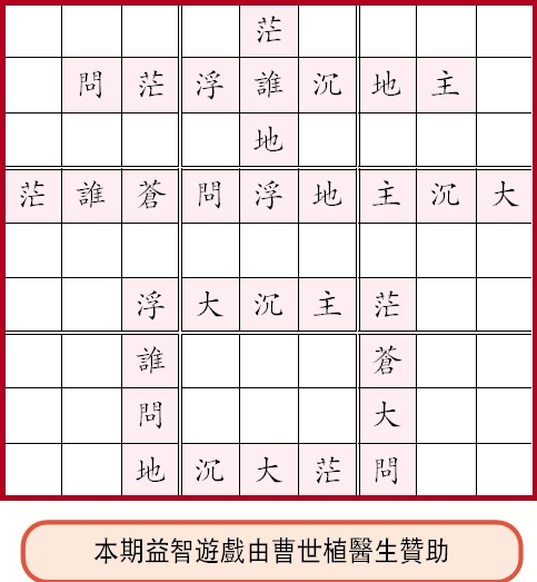 今期吉字盤的遊戲藏了毛主席沁園春裡家傳戶曉的一句,請你按「說得活」規則:「九個字:填滿盤、橫直行、九格宮、都有它、不重複、不欠缺;但可以、亂次序;要找出:這一句,說得活」,請大家從盤中找出那一行!讀者如需答案的「四字碼」「題解」,可記下見報日期,電郵tsoww@tsoww.com索取。