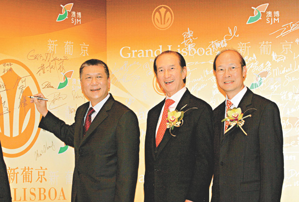 圖:澳門特別行政區行政長官何厚鏵、何鴻燊、蘇樹輝合照於新葡京開幕式上