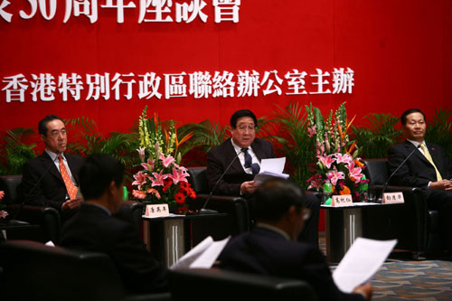 今天,我們香港各界人士在這裡舉行座談會,隆重紀念全國人大常委會《告台灣同胞書》發表三十周年,全面回顧兩岸關係波瀾壯闊的發展歷程,深刻領會中國政府對台大政方針,廣泛動員香港各界人士,牢牢把握兩岸關係和平發展的主題,為開創港台關係新局面而繼續團結奮鬥。