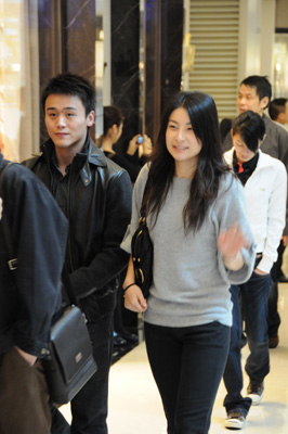 圖:郭晶晶(左二)與前隊友胡佳(左一)前往購物(本報攝)