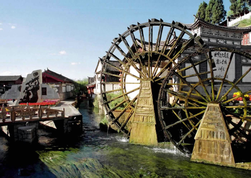 □麗江擁有3項世界遺產桂冠:麗江古城為世界文化遺產、「三江並流」保護區入選世界自然遺產、而納西族東巴古籍於2003年列入「世界記憶名錄」。圖為麗江古城標誌建築──大水車