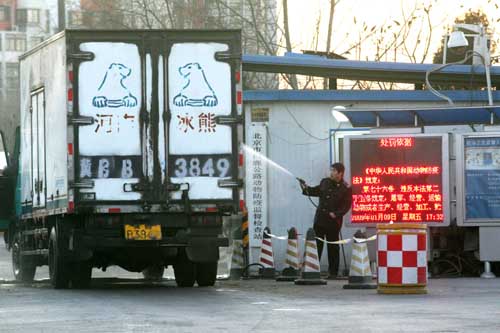 九日,設立在京沉高速白露收費站旁的動物防疫檢查站正在對運輸生鮮肉類的進京車輛進行噴霧消毒。司機需停車出示檢疫證明和消毒證明,經檢驗員查證、驗物無誤後才能蓋章放行。(中新社)