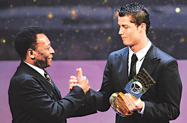 圖:C朗拿度(右)接受頒獎嘉賓、球王比利的祝賀 (法新社)