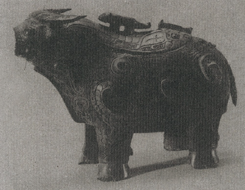 其實戰國時代早期山西一帶也留存少量青銅浮雕紋犧尊,為背開三口(中口內嵌一釜)的立體牛形,同樣以環穿牛鼻,牛角卻向下彎捲,全身滿布各種獸形紋飾,洵為難得的珍稀品。