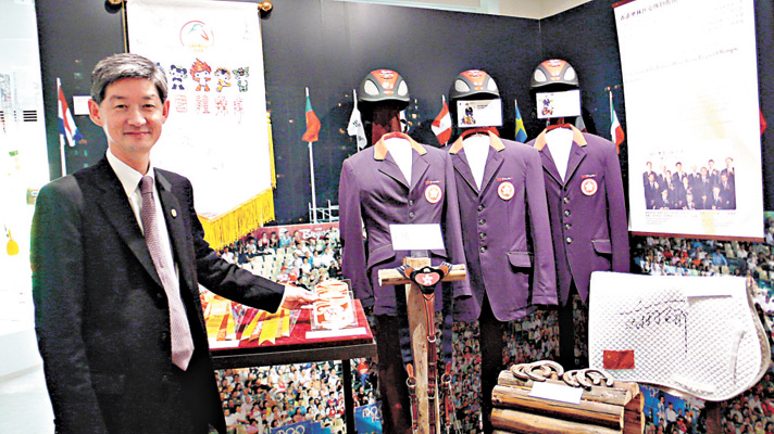圖:饒恩培手執的是頒予馬術比賽首八名得獎馬匹的紀念牌;三套服裝由馬術運動員林子心(左起)、鄭文傑及林立信捐贈;右下角是劉麗娜曾使用的鞍墊(本報攝)