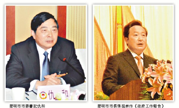 圖:昆明市市委書記仇和(左),昆明市市長張祖林作《政府工作報告》