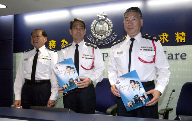圖:(左起)曾偉雄、鄧竟成及任達榮在記者會上,講述警隊今年的主要工作範疇(本報攝)