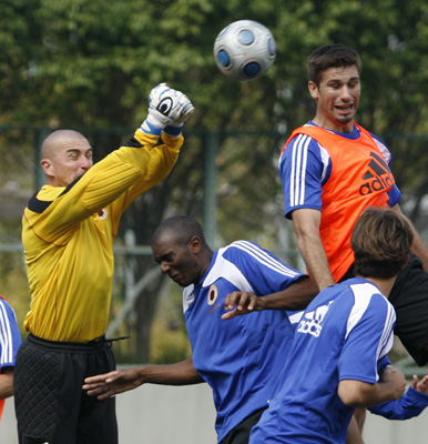 圖:港聯的祖爾(右上)於練習角球攻勢時衝門(本報攝)