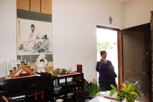 圖:余麗莎向傳媒介紹其家裡珍藏的字畫和古董