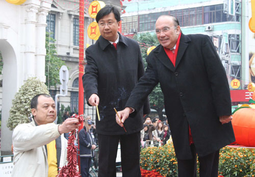 圖:澳門旅遊局局長安棟樑、民署管理委員會主席譚偉文於議事亭前地點燃爆竹
