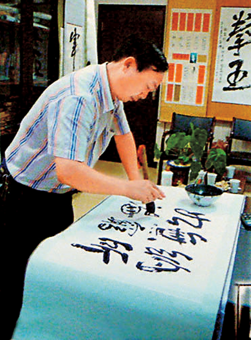 圖:楊明示範書法,牆上「拳王」二字是贈送給第二十九屆奧運會拳擊冠軍貴州選手鄒市明的書法作品
