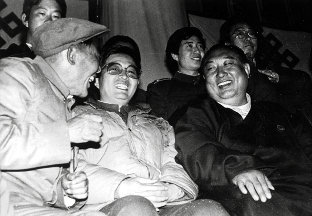 圖:1989年1月,班禪大師與新上任的中共西藏自治區黨委書記胡錦濤(左二)在東靈塔開光大典上談話(《紫荊》雜誌供圖)