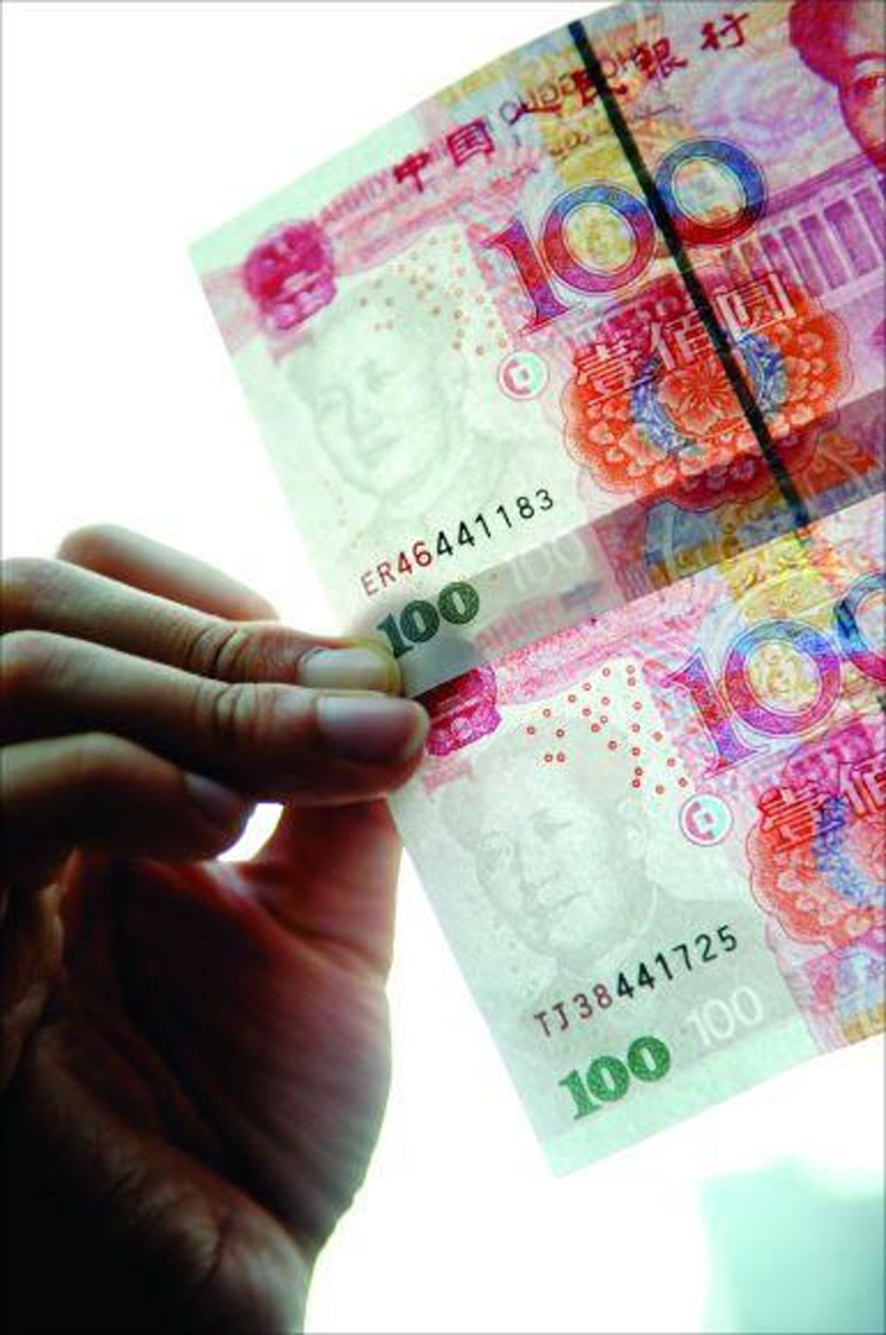 圖:開頭為「TJ38」的百元假幣與上面的真幣比較,其毛澤東頭像水印部分的質感有着肉眼可以分辨的不同