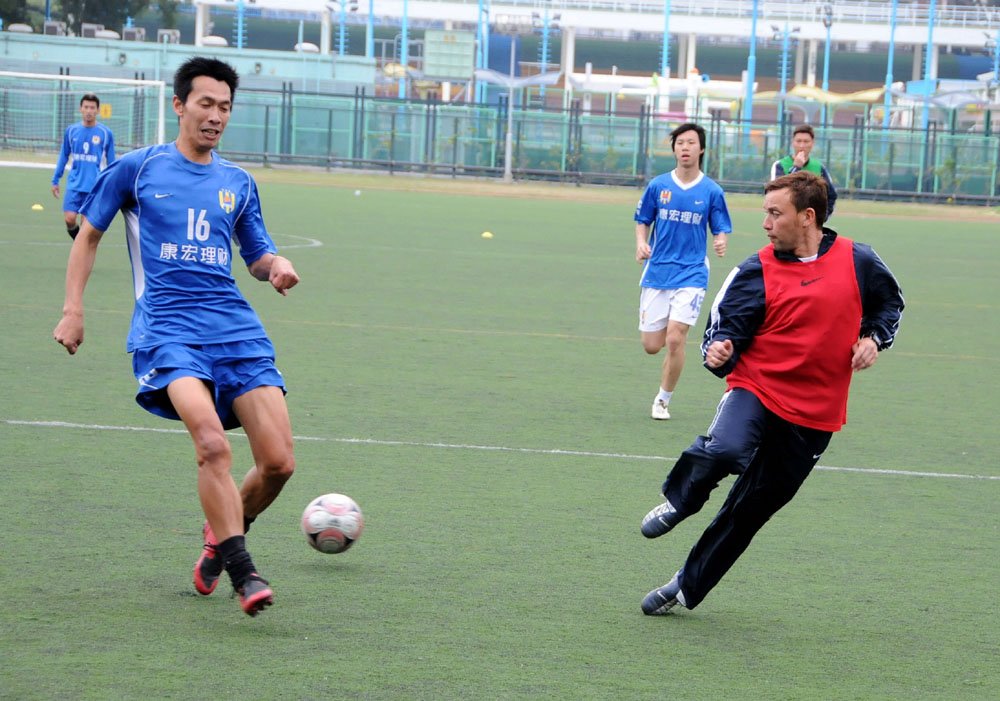 圖:晨曦教練山度士(右)在與賴啟卓(左)的對抗中不落下風(本報攝)