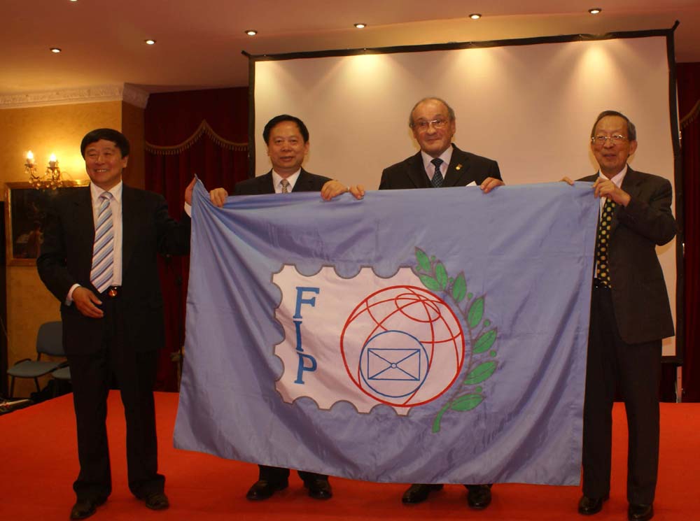 圖:在2007羅馬尼亞世界郵展上,洛陽市代表接過國際郵聯會旗